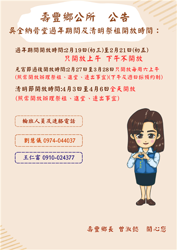 ::: 服務公告服務時間公告訊息祭拜須知 ::: 首頁 > 服務公告 > 公告訊息 請輸入關鍵字 進階搜尋 公告訊息 115年吳全納骨堂過年期間及清明祭祖開放時間 發布日期:115/01/21 附件 開放時間 更新日期:115/01/21 回列表 ▲TOP